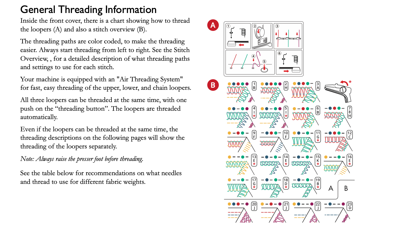 Select your stitch, and the optimal thread tensions, recommended stitch length, and more are set automatically and displayed on the color touchscreen. Includes multi-language options and information on how to use each stitch.