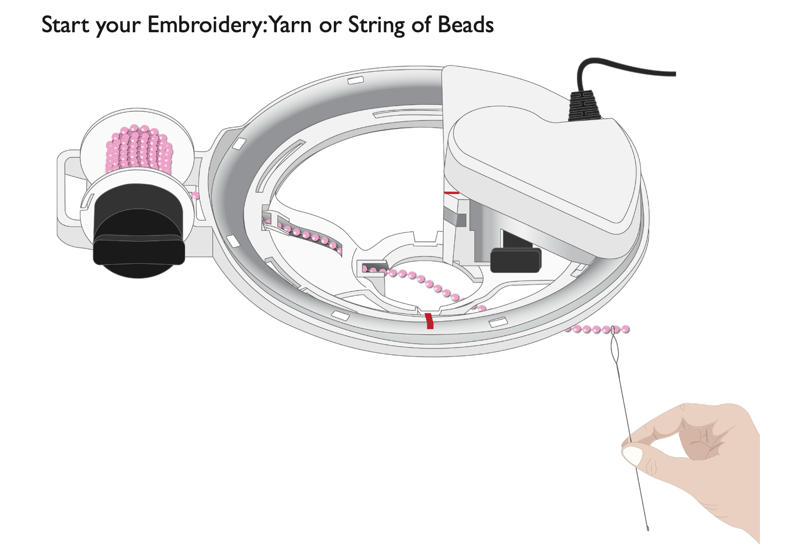 The DESIGNER™ Embellishment Attachment takes the ribbon embroidery attachment to the next level. Not only will this device create wonderful ribbon embroideries, it will also couch beads and yarn to create designs never seen before in the home embroidery market.