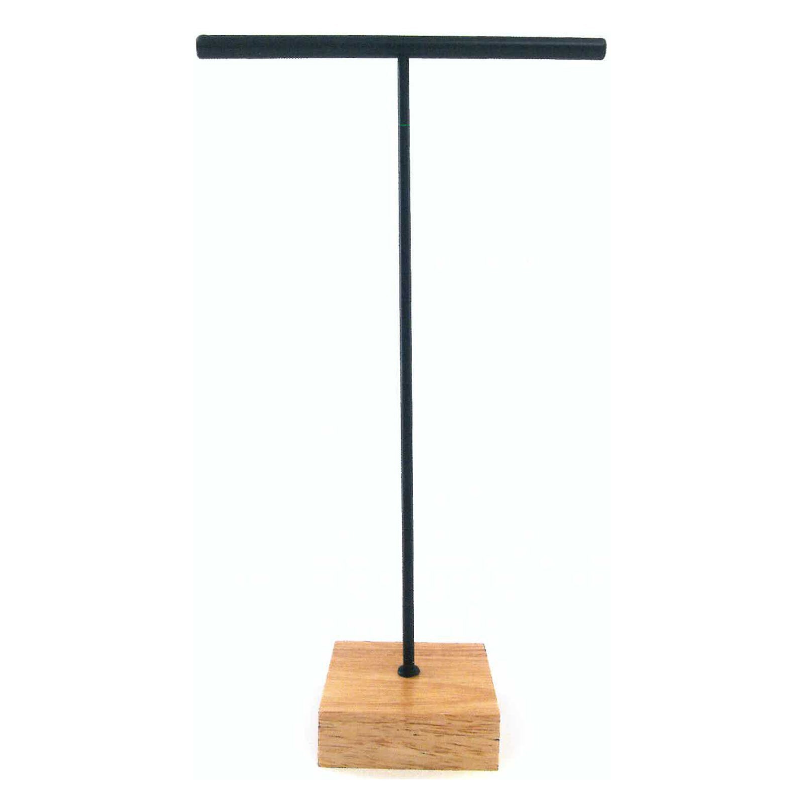 This tabletop stand is easy to assemble and features a solid wooden base and two metal rods.