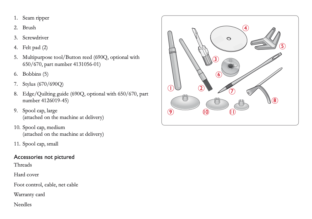 This warranty is for household (non-commercial) use and does not cover conditions unrelated to the material or workmanship of the product. Such unrelated conditions include, but are not limited to: (a) damage caused by current or voltage other than that stamped on the nameplate of the product, if applicable; (b) damage resulting from the failure to provide normal maintenance; (c) failure to follow instruction for use of the product as stated in the owner’s manual; (d) any accident to, or misuse of, any part of the product; (e) any defects or damage caused by service or alteration by anyone other than HUSQVARNA VIKING® or an authorized HUSQVARNA VIKING® Dealer/Service Center; (f) sewing materials that may be corrosive to metal or finish; (g) normal wear and tear; and (h) negligence.